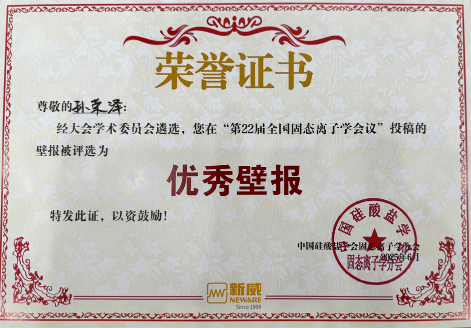 在能源科学领域的知名度。参加本次研讨会的还有团队中的部分研究生,其中孙荣泽凭借“高比能长寿命锂离子/锂氧气混合电池表界面反应调控及机理研究”荣获优秀墙报奖。
