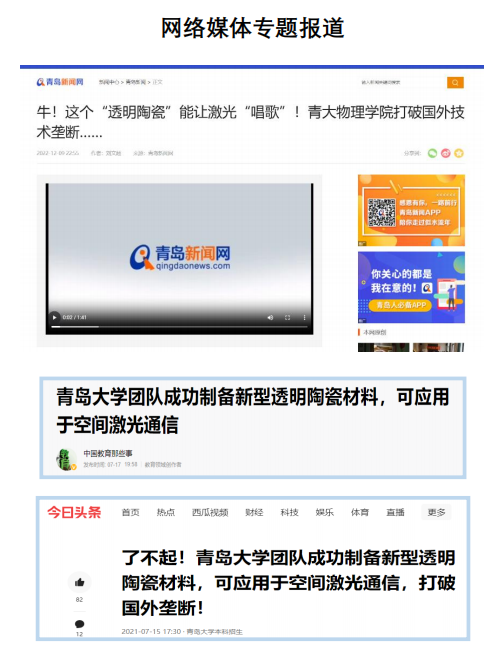 甘做冷板凳、勇啃硬骨头、十年磨一剑、攻克重大技术难题。透明电光材料是光通信器件的核心,也是制约我国光通信技术发展的卡脖子问题之一。美国已率先实现了高性能透明电光陶瓷的制备及器件研发,而国内一直未能突破。面对课题组前期研究基础薄弱、核心设备缺乏,测试设备不完善等困难,本人迎难而上,历时16年,先后自主研发透明陶瓷烧结热压炉,攻克粉体制备、坯体成型和陶瓷烧结等核心关键技术,成功制备出接近理论极限透光率的高性能透明电光陶瓷,并实现了自由空间光通信和血管壁的高频超声成像。被青岛电视台、搜狐、今日头条等多家媒体报道,并于华为等公司合作开展器件研发工作,相关成果获山东省自然科学二等奖。获批国家自然科学基金面上项目、广西重点研发计划子课题、山东省自然学科基金等10余项,发表高水平SCI论文50余篇,授权发明专利4项,逐渐形成了自己的特色,获得国内同行的认可,多次受邀参加学术会议并作邀请报告。基于该成果指导学生竞赛获奖全国大学生光电设计大赛二等奖2项、山东省互联网+、挑战杯省赛金奖2项,科技创新大赛、中国(青岛)国际精英创业创新大赛等奖项20余项。获评山东省创新创业大赛优秀指导教师、嘟嘟成人网